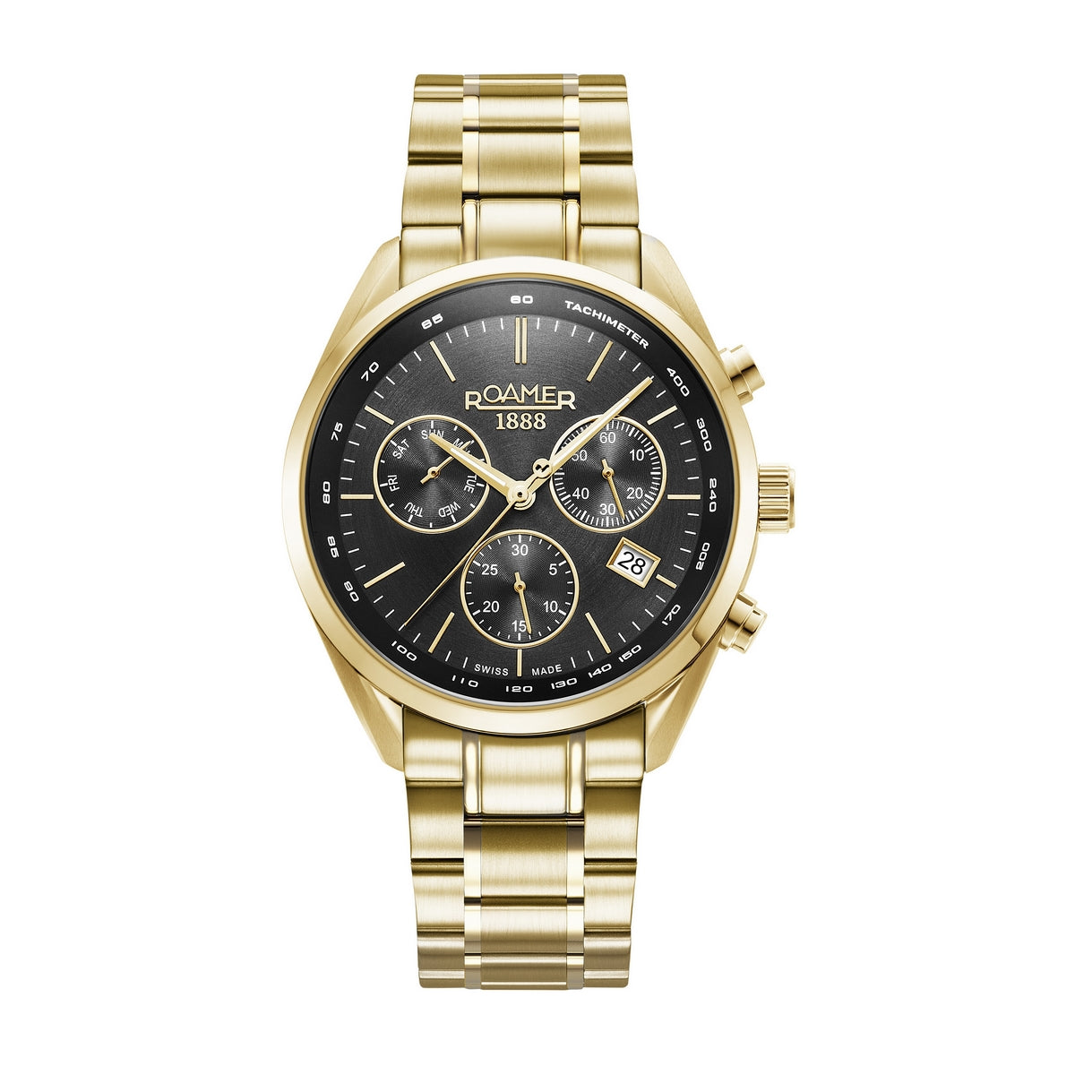 ROAMER PRO CHRONOGRAPH GENTS GOLD PLATED BLACK DIAL BRACELET WATCH