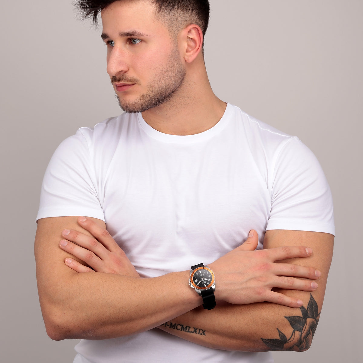 MOVEMENT TYPE: Quartz MOVEMENT CALIBRE: BAND TYPE: Silicone CLASP TYPE: DIAL COLOUR: Black WATER RESISTANCE (Metres): 100 CASE WIDTH: 41mm CASE DEPTH: 10.8mm GLASS TYPE: Mineral Crystal DATE FUNCTION: STONE TYPE: