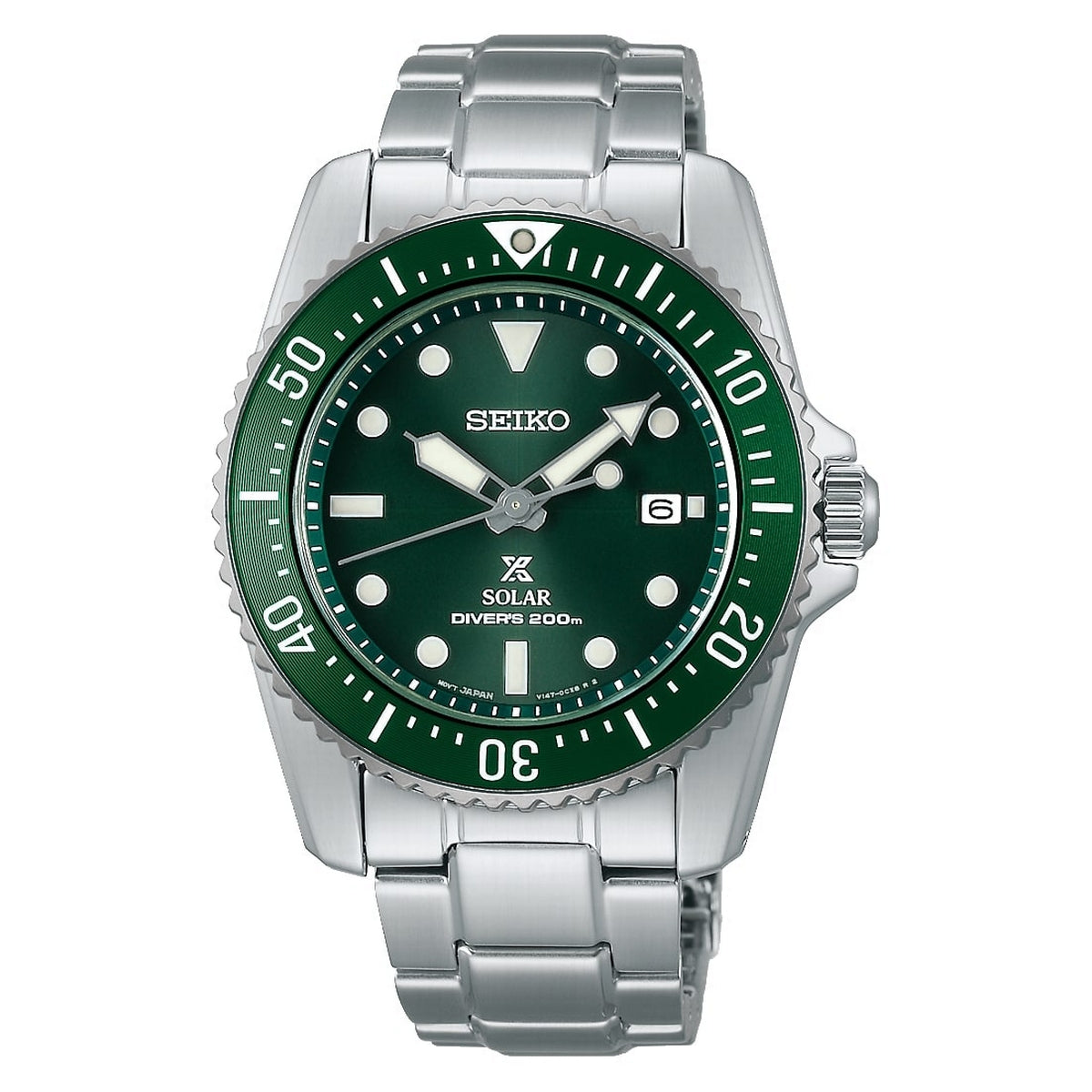 MOVEMENT TYPE: Solar MOVEMENT CALIBRE: V147 -15/+15 seconds per month BAND TYPE: Stainless Steel Bracelet CLASP TYPE: Three Fold Clasp with Secure Lock and Slide Adjust DIAL COLOUR: Green WATER RESISTANCE (Metres): 200 CASE WIDTH: 38.5mm CASE DEPTH: 105mm GLASS TYPE: Sapphire Crystal DATE FUNCTION: Date Only STONE TYPE: