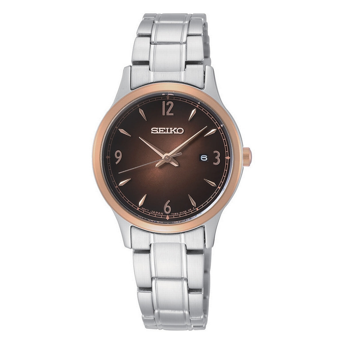 SEIKO QUARTZ LADIES TWO TONE STEEL BROWN DIAL BRACELET WATCH Gents version to match MOVEMENT TYPE: Quartz MOVEMENT CALIBRE: 7N82 BAND TYPE: Mixed Metal Bracelet CLASP TYPE: Z-Clasp DIAL COLOUR: Brown WATER RESISTANCE (Metres): 100 CASE WIDTH: 28.7mm CASE DEPTH: 5mm GLASS TYPE: Hardlex DATE FUNCTION: Date Only STONE TYPE: