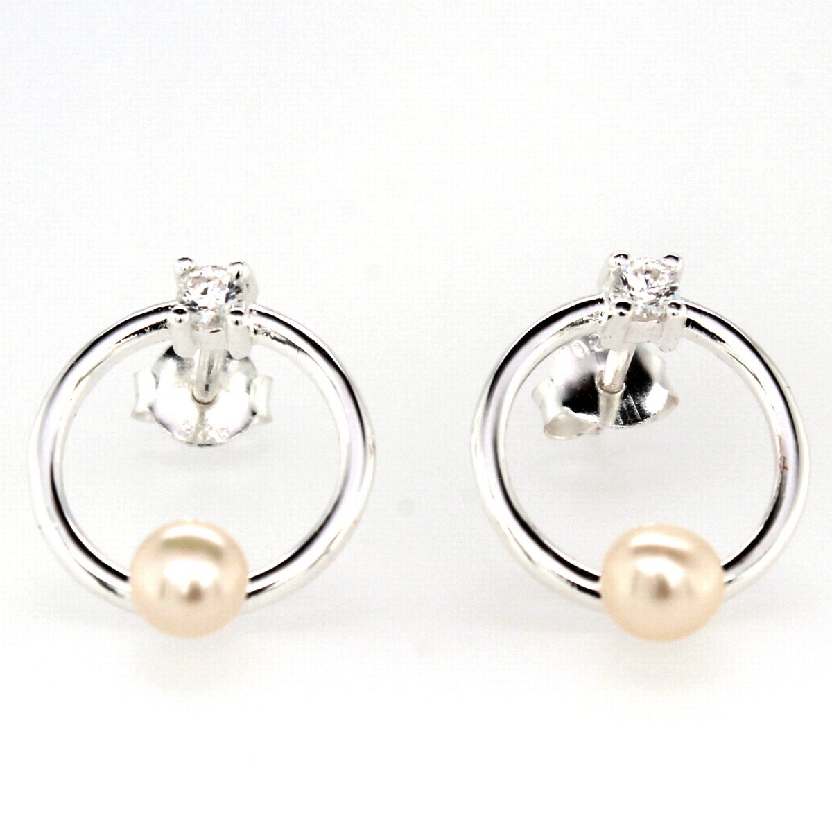Silver Pearl and CZ Open Plain Circle Stud Earrings