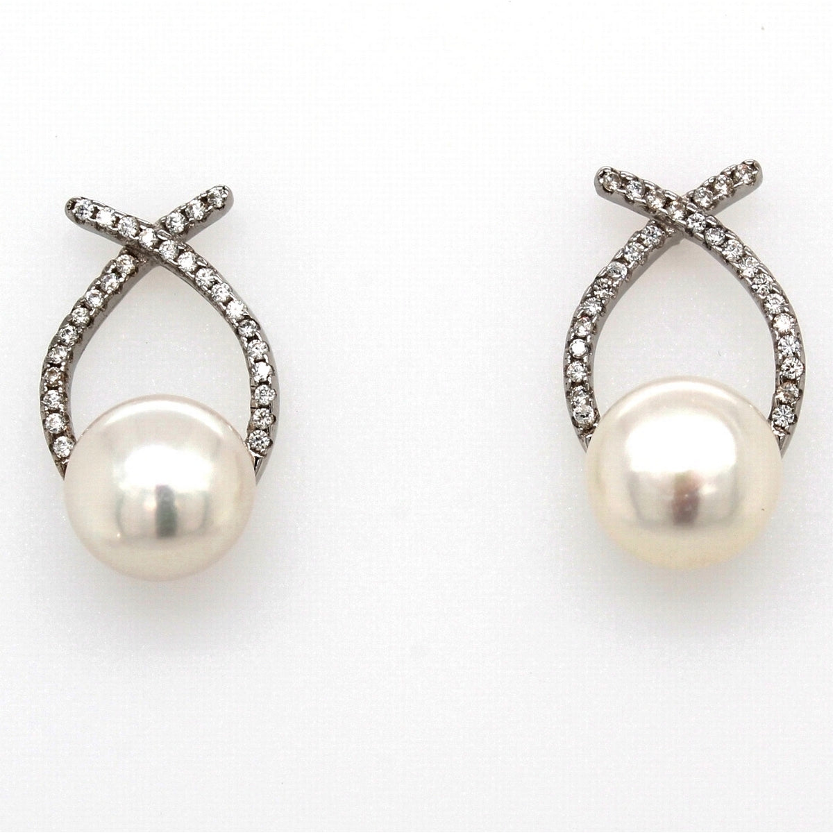 Silver Round Pearl And CZ Wishbone Stud Earrings 9.5mm