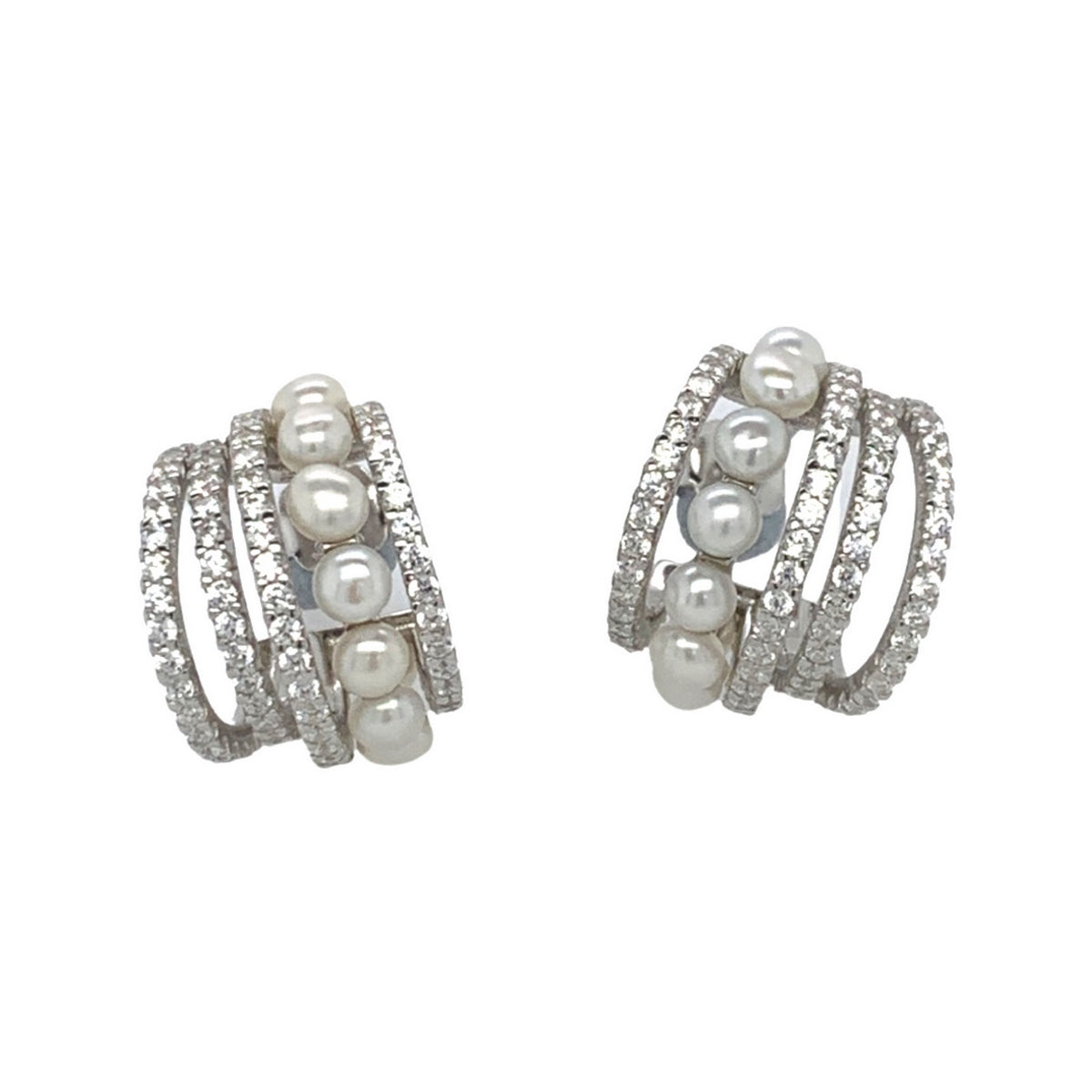 silver push back 5 row earrings with freshwater pearls and cz