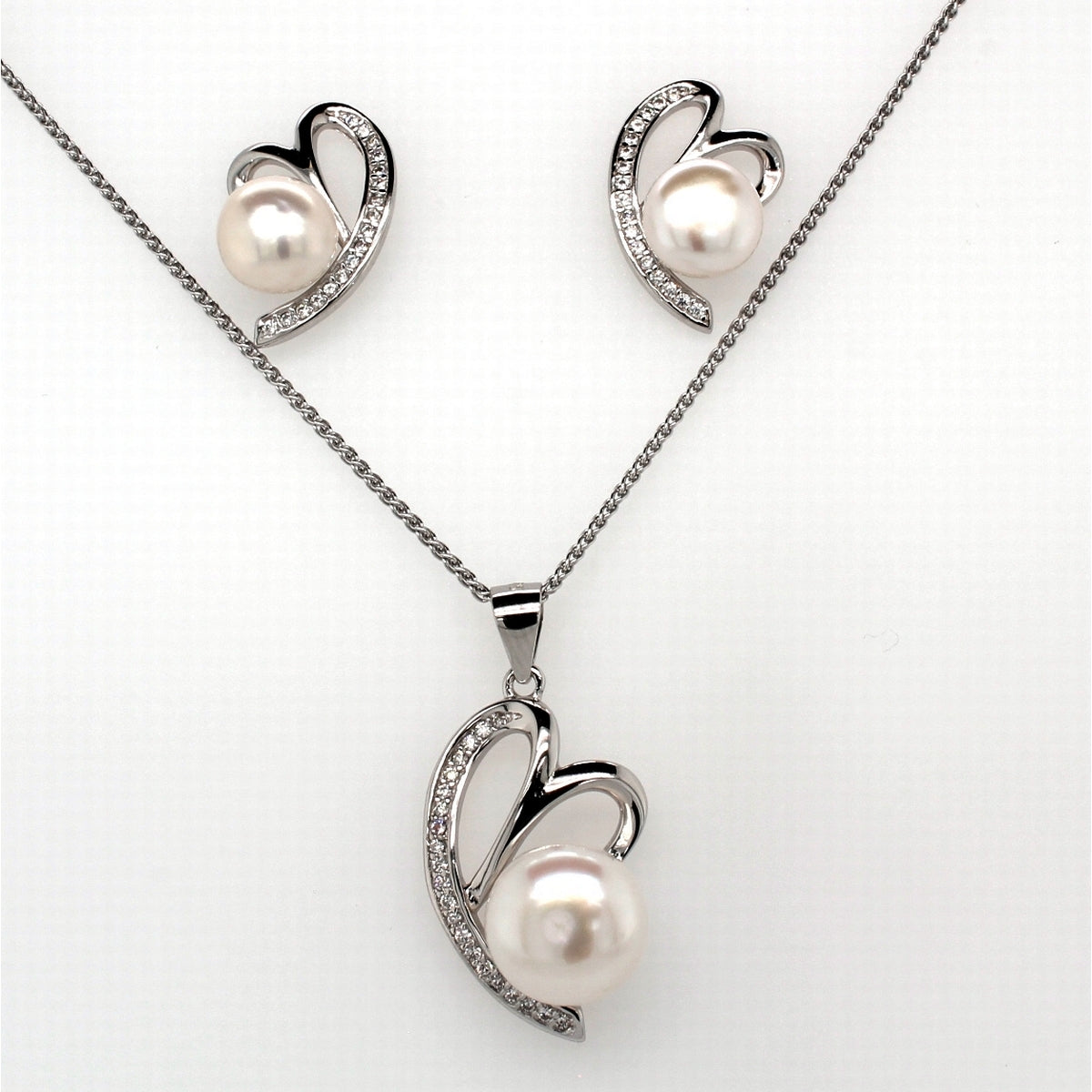 Silver Pearl And CZ Love Heart Stud Earring And Pendant Set 7.5-9.5mm
